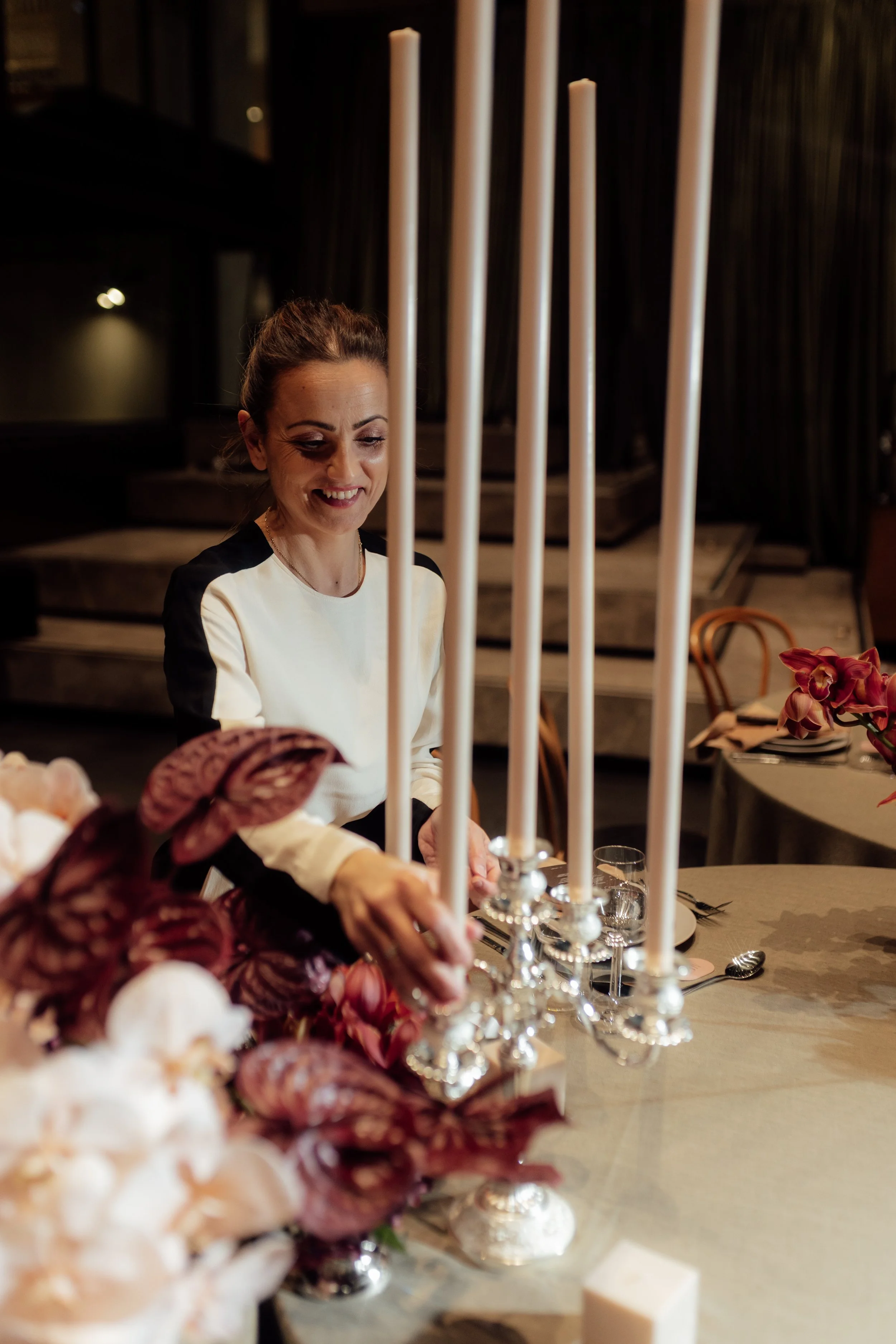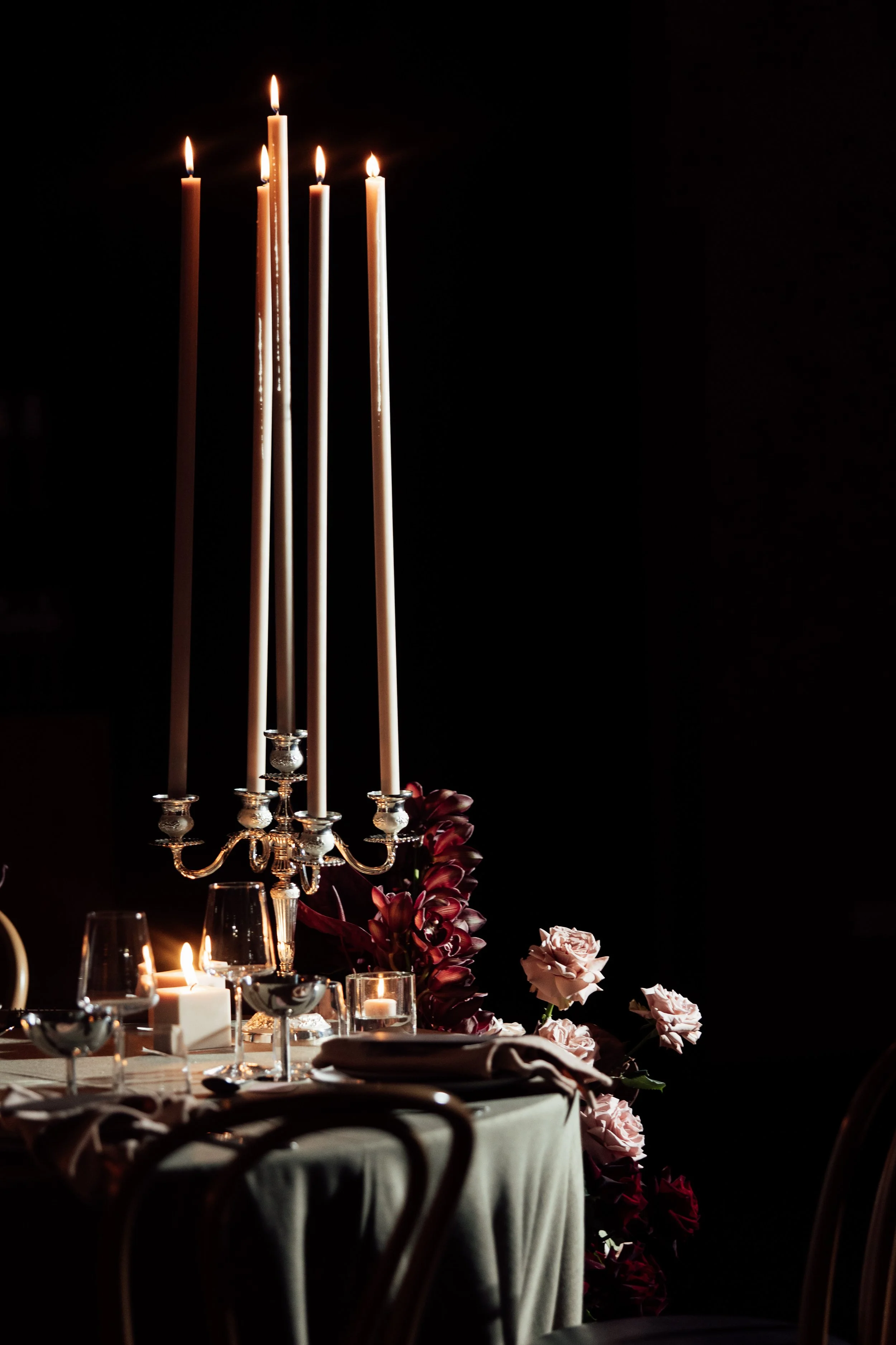 Example: Soft, warm lighting enhanced the richness of the plum, berry, and chocolate palette, highlighting floral arrangements and tableware while maintaining a sophisticated atmosphere.
