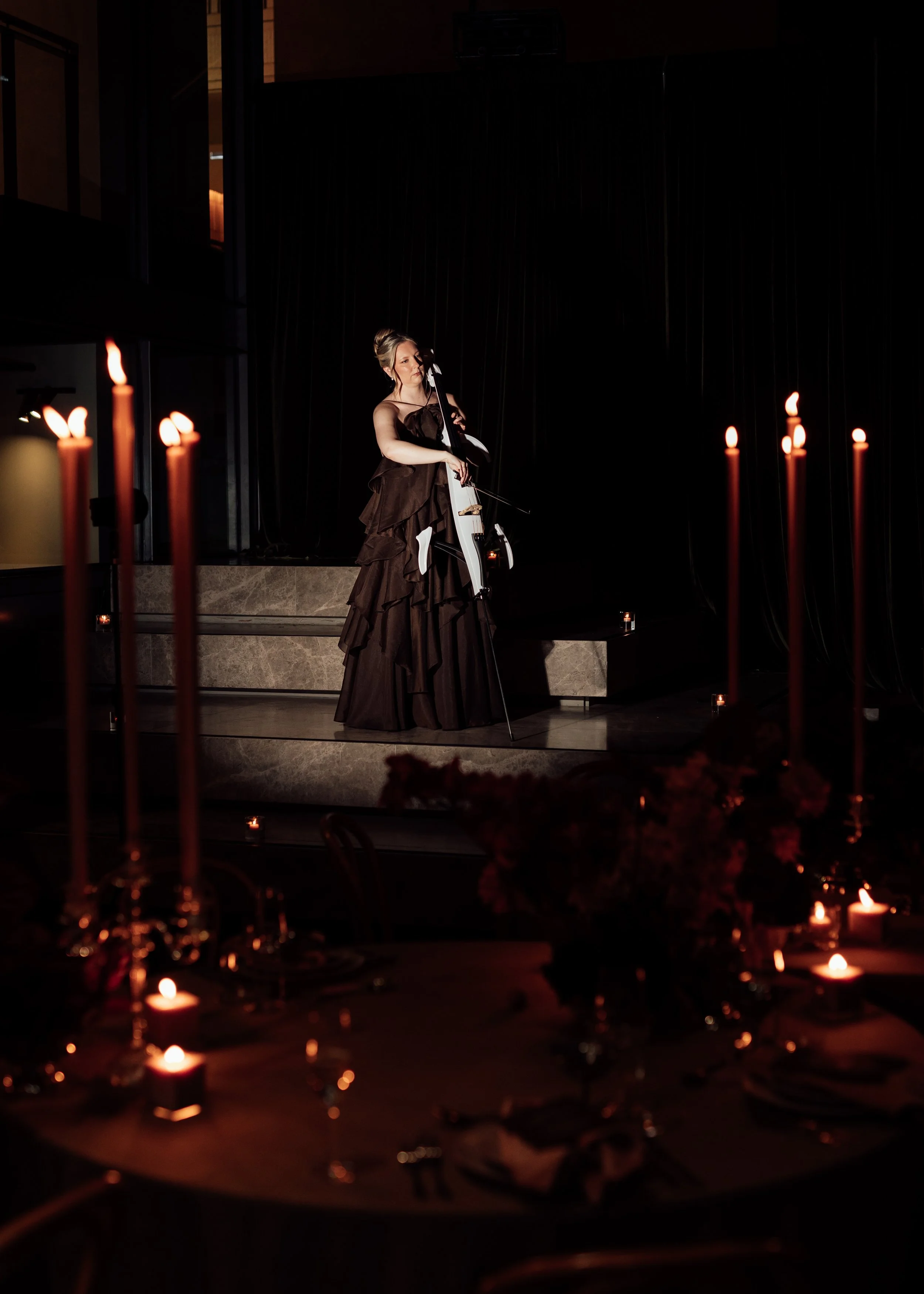 Live music dramatically enhances an event’s ambience. For guest arrival, the talented Adorn Strings provided a solo performance, welcoming attendees with a luxurious, elegant feel. During dinner, Jeremy Louis performed live background music, creating a sophisticated, immersive soundtrack for the evening.