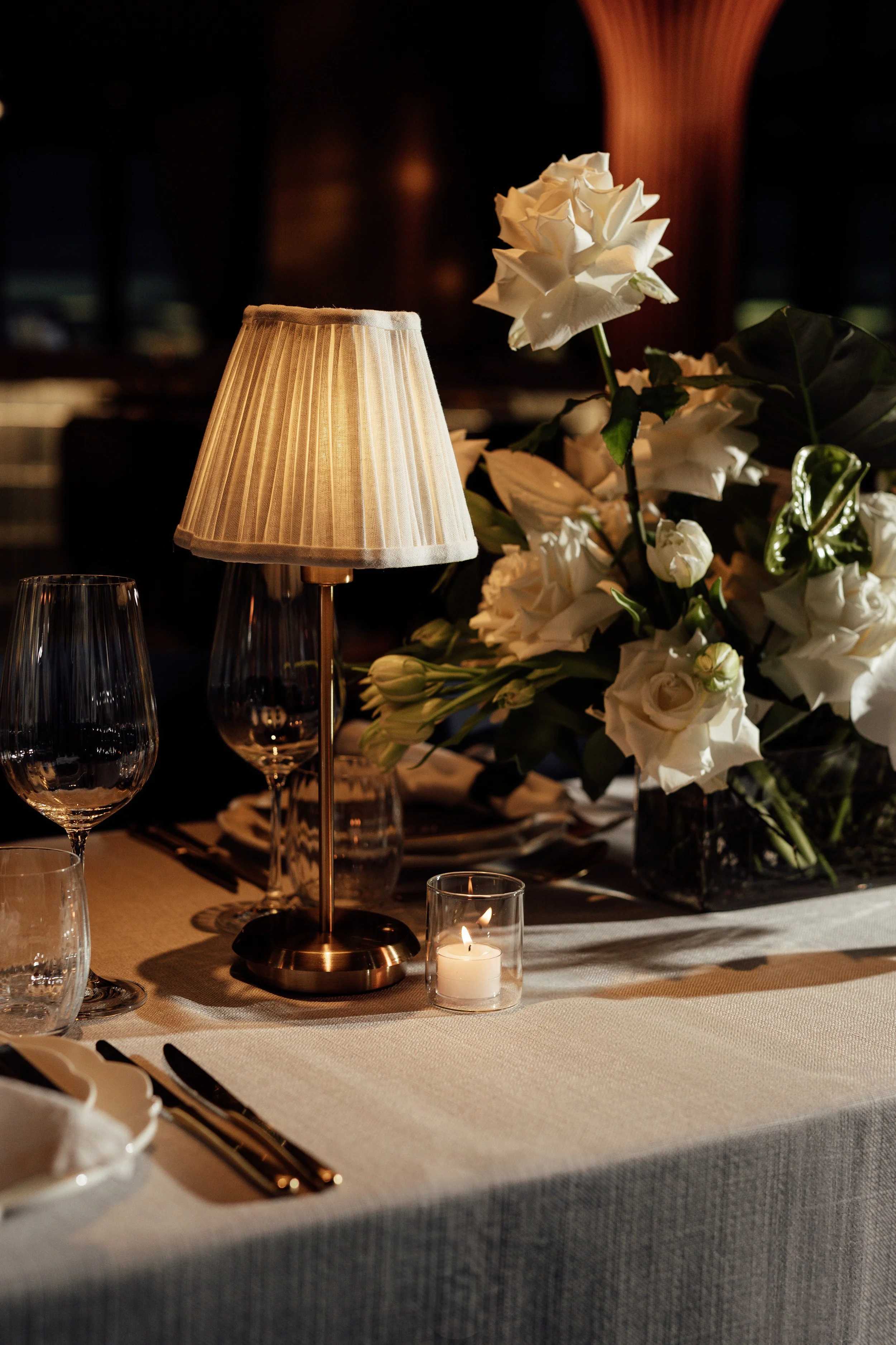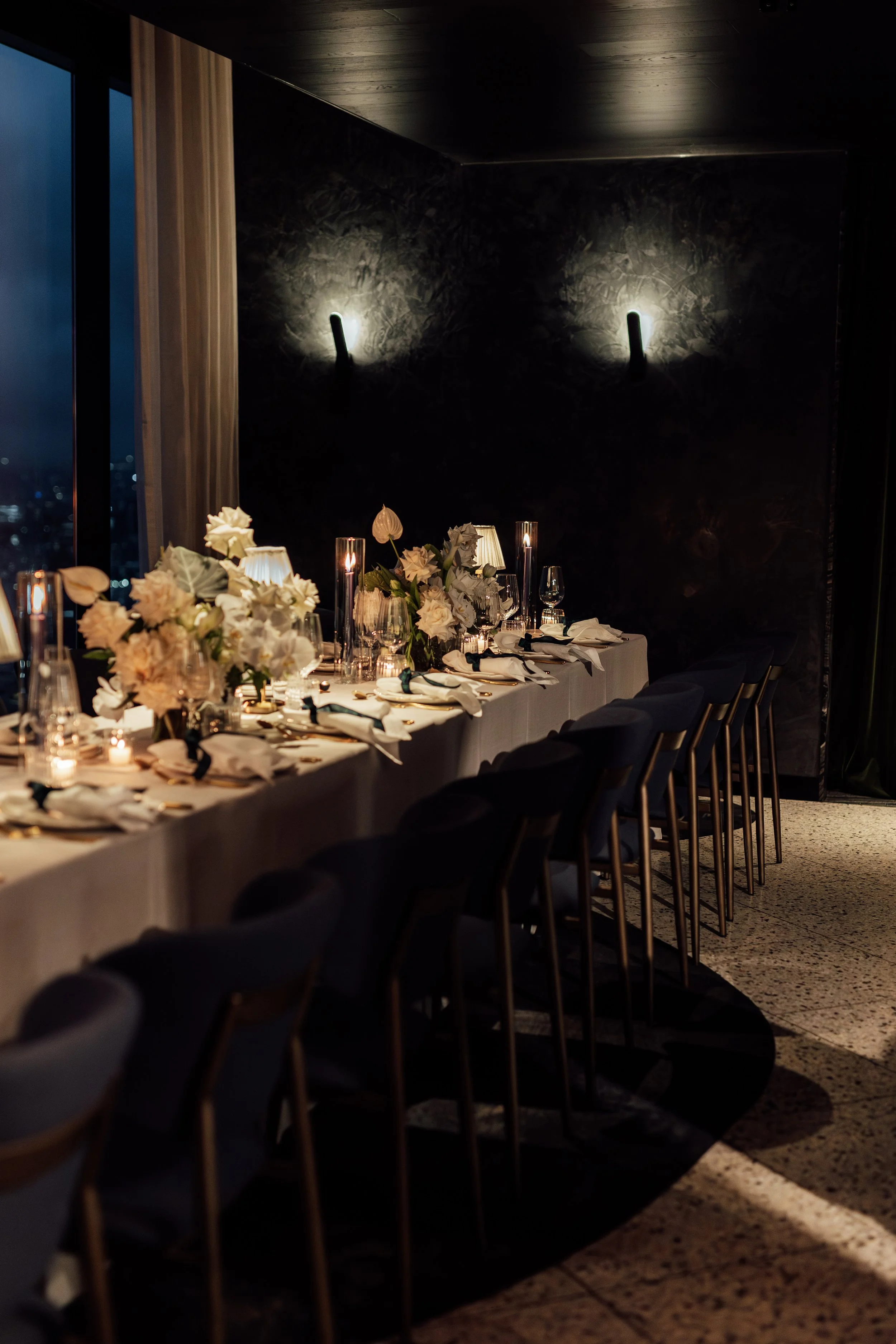 Beyond the visuals, we design events to engage guests emotionally. Lighting, florals, textures, and layouts are orchestrated to foster connection and celebration. In this dinner, the combination of city skyline views, soft lighting, and rich textures created an atmosphere that was both luxurious and intimate.