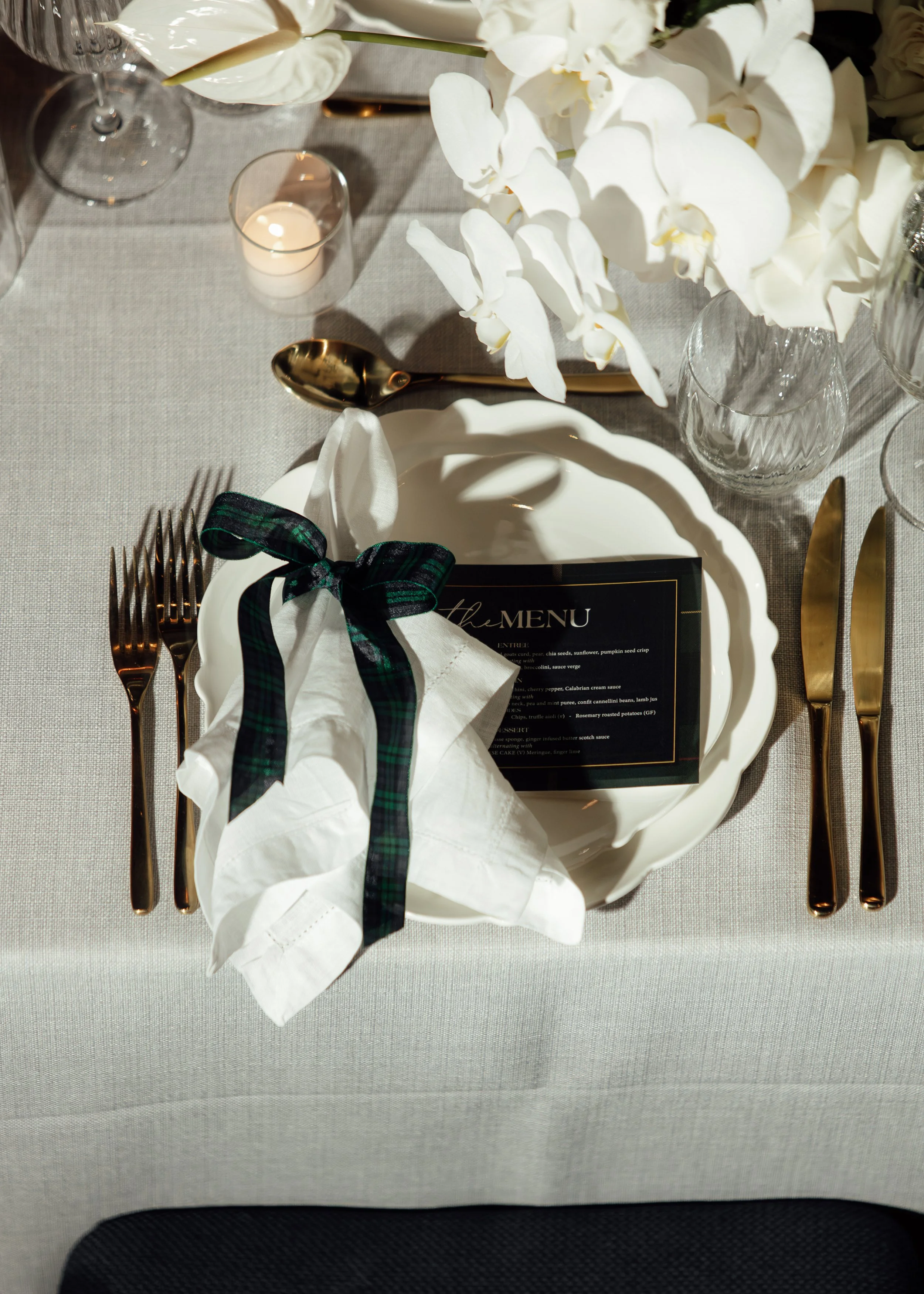 The tartan — present in both the napkin ties and menu borders — was a small detail with a big impact, linking the evening to the CEO’s heritage and making each guest feel part of the narrative.